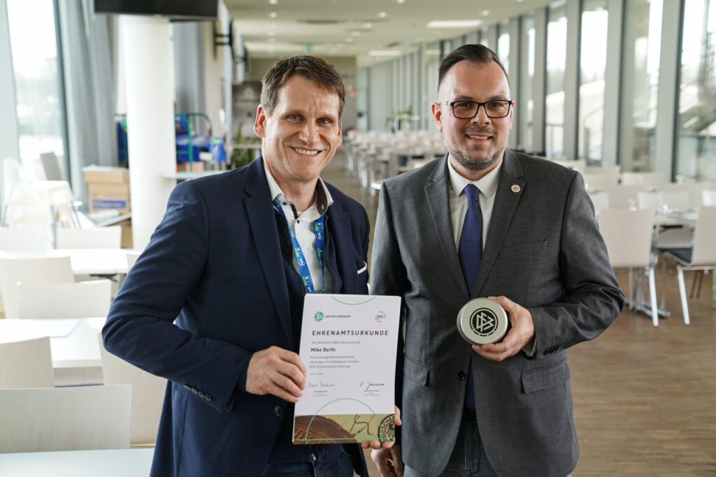 Für herausragendes ehrenamtliches Engagement wurde Mike Barth am vergangenen Wochenende mit dem DFB Ehrenamtspreis ausgezeichnet. Diese Auszeichnung vergeben der DFB und die Landesverbände im Rahmen eines Dankeschön-Wochenendes welches dieses Jahr in Stuttgart ausgetragen wurde. Los ging’s für die Ehrenamtlichen am Freitag mit einem Abendessen im Restaurant des Mercedes-Benz-Museums. Matthias Schöck, Präsident des Württembergischen Fußballverbandes, eröffnete das Wochenende und drückte den Anwesenden seine Wertschätzung aus. Im Anschluss folgte ein stimmungsvolles Bundesliga-Spiel in der MHP-Arena beim Sieg des VfB Stuttgart gegen Union Berlin.