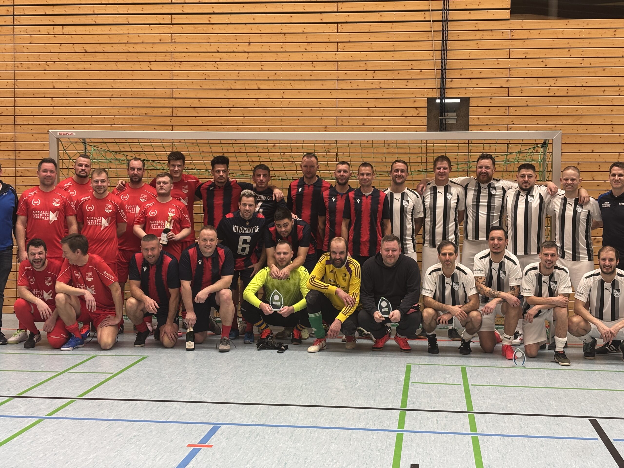 Ab 17:30 Uhr ging es dann los mit dem traditionellen AH-Turnier, bei dem acht Mannschaften zunächst in zwei Gruppen gegeneinander antraten, bevor es dann in die KO-Phase ging. Wieder dabei waren unsere Freunde aus Tótvázsony, die, wie in den Vorjahren, die 1000 km extra für die Hallentage angereist sind. Für ihre Strapazen belohnten sich die Ungarn selbst mit dem AH-Turniersieg. Nach einem langen Samstag mit ununterbrochenem Fußball ging es dann zum gemütlichen Teil über.